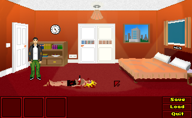 Visually, the game is presented in a simple, almost cartoon style, however this works well with the difficult subject matter. The focus isn't on the gory details - though they be presenting their bodily fluids to all who can bear to watch - instead it's on Sam's attempts to cope with his predicament. That's not to suggest that the graphics were an afterthought. On the contrary, the backgrounds are full of nice touches like the light cast from lampshades and ruffles in the duvet covers of the hotel bed. Not to mention the blood trail leaking from the abdomen of the unfortunate young woman lying in the middle of the floor..